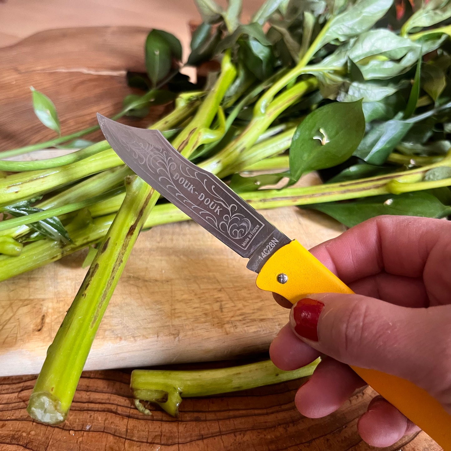 The Douk-Douk handcrafted in France, is lightweight and slim, making it an ideal pocket knife for everyday use. Originally created in 1929 by Gaspard Cognet, it was intended to be an affordable option for ordinary working people. The handle includes a depiction of a "Douk-Douk", a Melanesian spirit. Its design was inspired by the engraving in an illustrated dictionary. The stainless steel blade showcases an etched arabesque blade with Douk Douk engravings, and its slip joint construction is in both closed and 90-degree positions. The Douk-Douk Knife embodies the legacy of French knife-making excellence.
