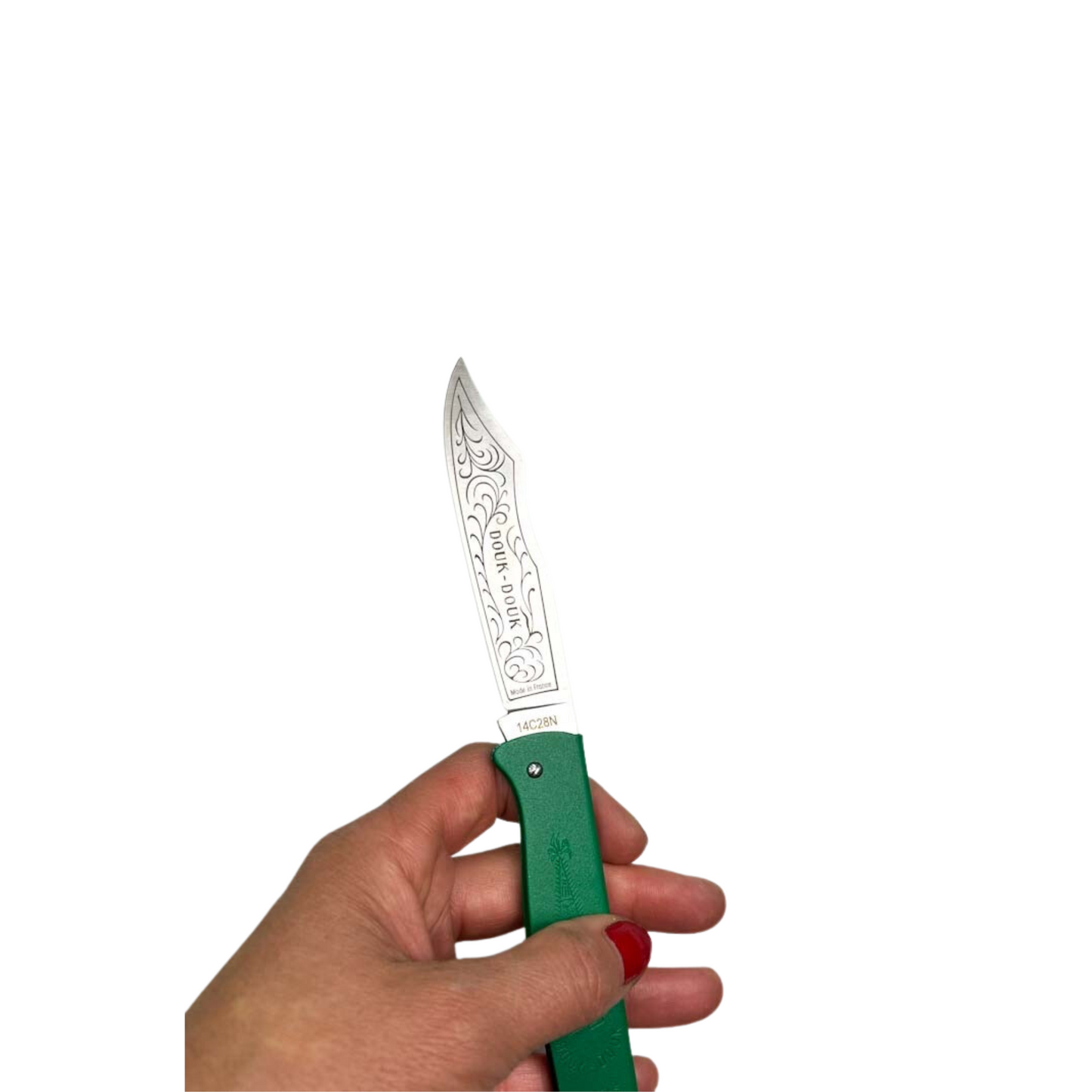 The Douk-Douk handcrafted in France, is lightweight and slim, making it an ideal pocket knife for everyday use. Originally created in 1929 by Gaspard Cognet, it was intended to be an affordable option for ordinary working people. The handle includes a depiction of a "Douk-Douk", a Melanesian spirit. Its design was inspired by the engraving in an illustrated dictionary. The stainless steel blade showcases an etched arabesque blade with Douk Douk engravings, and its slip joint construction is in both closed and 90-degree positions. The Douk-Douk Knife embodies the legacy of French knife-making excellence.